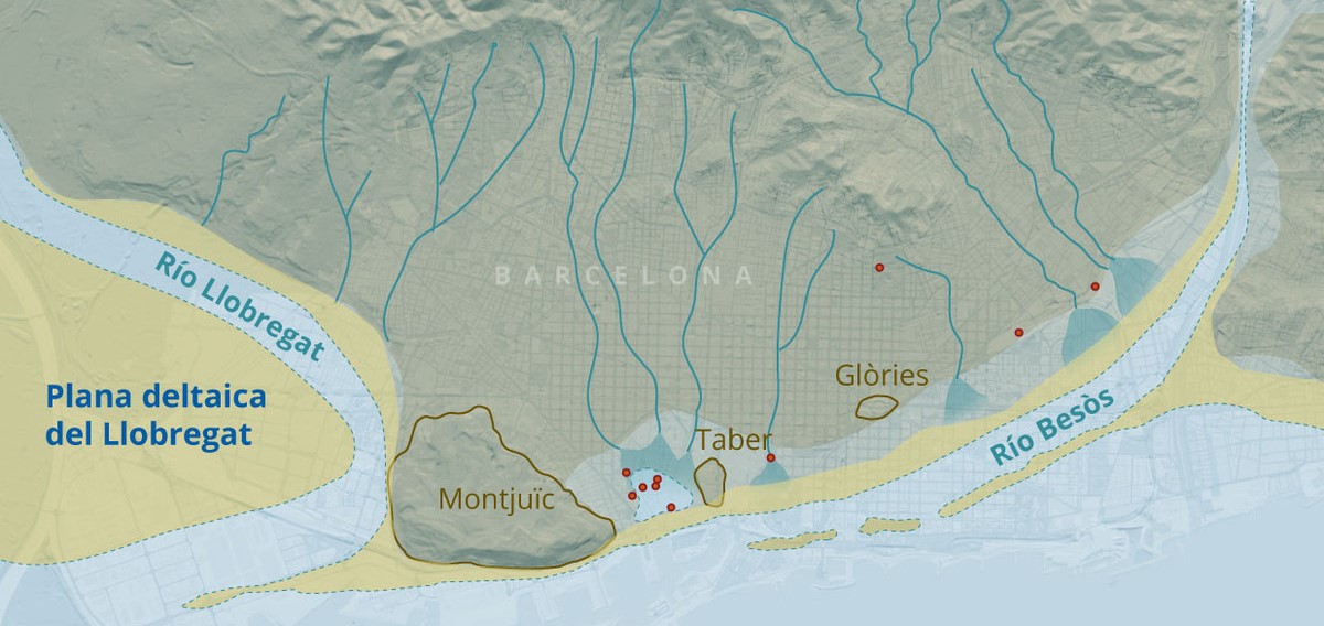 A lo largo del neolítico,las desembocaduras de las rieras formaron un escalón que separa la plataforma elevada que formaba la «tierra firme»de la ciudad(hoy aún puede rastrearse en lugares como el inicio de la Vía Laietana o las escaleras de los pasajes de la calle Trafalgar,profundas lagunas de agua dulce). La mayor laguna,la del Cagalell,llegó a tener 25 hectáreas y hasta 20 metros de profundidad. Se han encontrado otras similares en Poble Nou(Can Ricart) y La Pau.