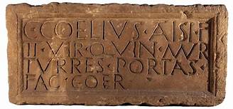 Una lápida de tres líneas y media ha confundido durante más de un siglo a arqueólogos e historiadores,hasta el punto de haberles hecho especular con una pre-Barcino republicana,construida en Montjuïc dos siglos antes que la ciudad imperial. La tesis doctoral de Alessandro Ravotto sobre las murallas de Barcelona también soluciona este enigma,con una propuesta que fundamenta documentalmente: la lápida,expuesta en el Museu d’Arqueologia de Catalunya y que reza «Caius Coelius,hijo de Atisius,duunviro quinquenal,se ocupó de la construcción de muros,puertas y torres»,formaría parte de la muralla fundacional,y habría presidido probablemente la puerta suroeste de la ciudad,la que se abriría cerca de la actual calle del Call.